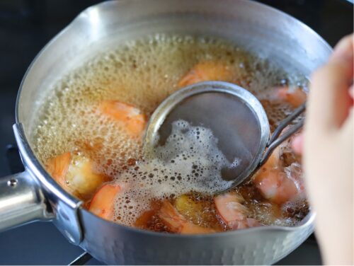 有頭えびなら頭に火が通りにくいので、大きさに合わせてある程度しっかり煮たほうが良いと思います。