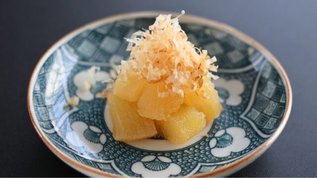 長時間水にさらすのも、下ゆでに酢を使うのも、なるべく白っぽく仕上げるためです。