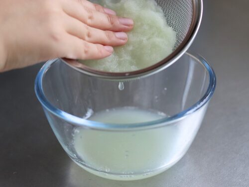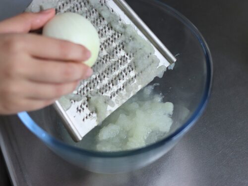 ❶たまねぎをすりおろし、汁気をやさしく絞る。