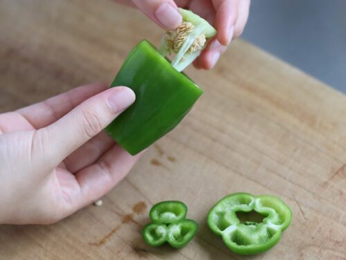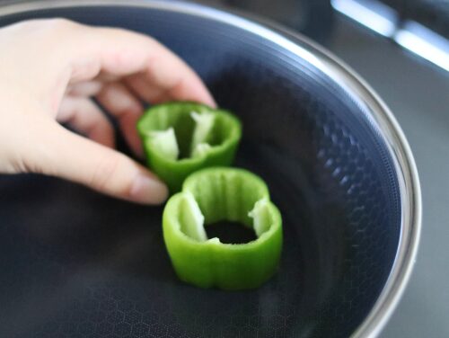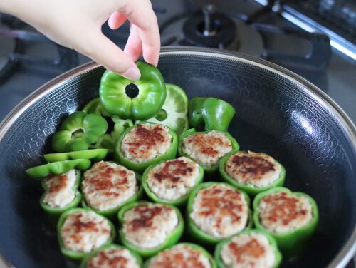 肉に火が通りやすいよう、ピーマンはかわいい輪切りにしてみました。