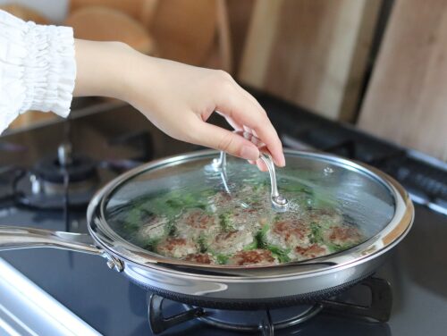 たまねぎはすりおろして軽く絞ると、蒸し焼きしてもビチャビチャにならず、肉だねの縮みも少なく、家族から好評です。