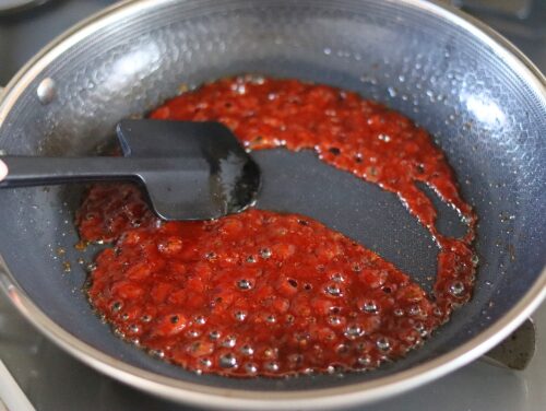 沸騰したら弱火にして混ぜながら1分ほど煮詰め、肉詰めの上に乗せる。