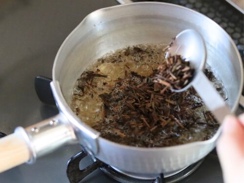 沸いたら茶葉を入れてすぐ火を止め、蓋をして1分蒸らす。