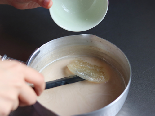 砂糖が溶けたら火を止め、ふやかしておいたゼラチンを加えて混ぜる。
