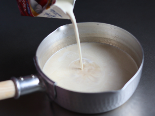 ❸❷に砂糖と牛乳を加え、火にかけて砂糖が溶けるまで温める(沸騰させない)。