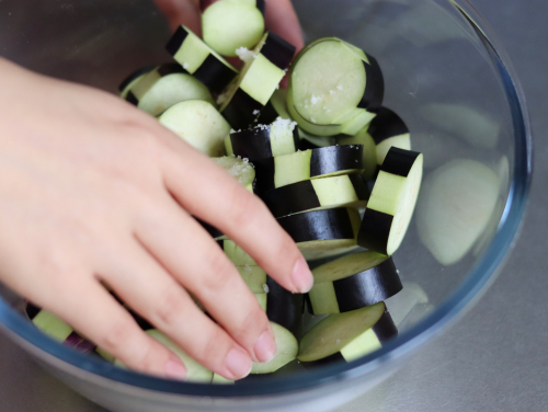 ❶なすのへたを取って皮を縞模様に剥き、1cmの輪切りにする。