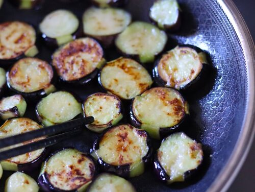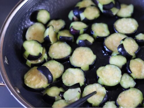 ❷フライパンに油を熱してなすを並べ入れ、両面をこんがり焼く。