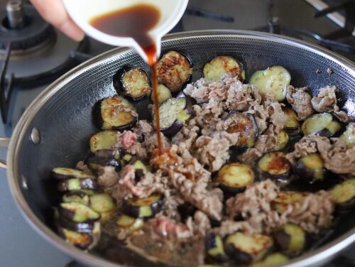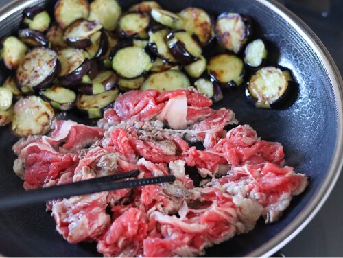 ❸なすを端に寄せ、空いたスペースに牛肉を入れてほぐしながら炒める。
