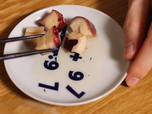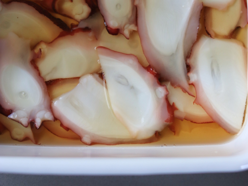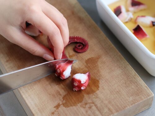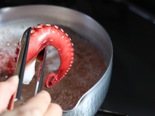 ゆでだこを買うとパックの中に水分が溜まっていて、それがちょっとにおうので、私は10秒ほど熱湯にくぐらせます。