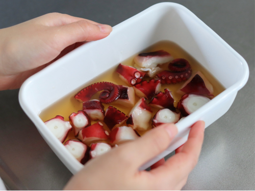 ※多くのたこが調味料から顔を出す場合は、ラップを密着させるように覆ってください。