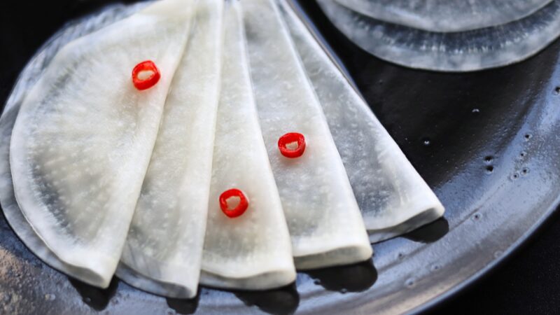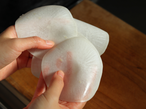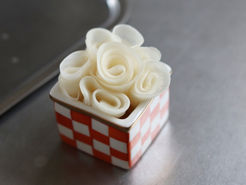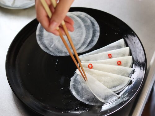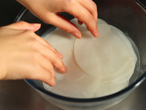 ❶かぶをよく洗って、繊維を断つようにごく薄く切る。