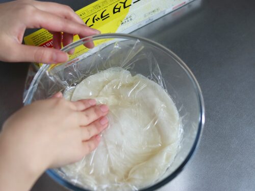 平らになるように広げながら甘酢に入れ、ラップをかぶせて密着させる。