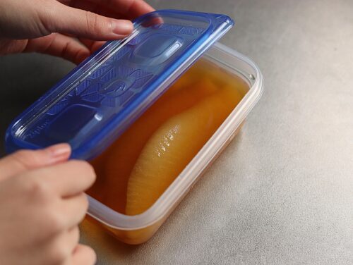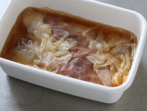 数の子がつけ汁から出ないよう、ガーゼをかぶせたまま容器の蓋をして保存します。