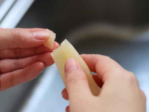 ❷数の子の表面の薄い膜を、ガーゼなどでやさしくこすって取り除く。