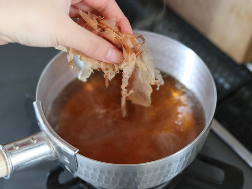 鍋にA(だし汁200ml、薄口醤油大さじ2、酒大さじ2)を煮立て、かつお節を入れて弱火で1分ほど煮出す。