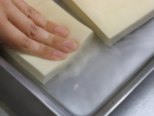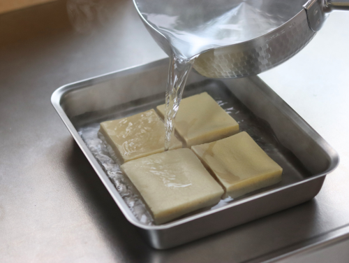 ❶高野豆腐をバットに並べ、60度くらいの湯をたっぷり回しかける。