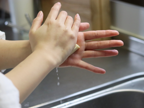 何度も水を換え、水がほとんど濁らなくなったら、手のひらではさんで水を絞る。