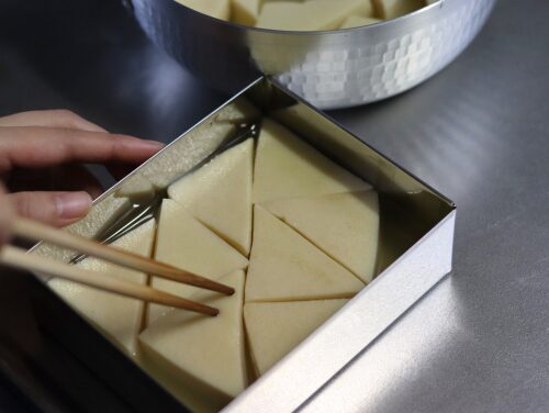 ❺きれいな形を保ちたい場合は、熱いうちに縁が垂直で高い容器(流し缶など)に並べ入れる。