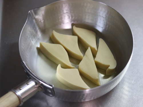 ❹鍋にA(だし汁600ml、砂糖50g、みりん大さじ2、塩小さじ1)を煮立てて高野豆腐を入れる。