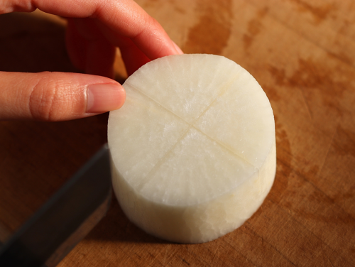❶大根を3.5cmの厚さに切り、皮を厚めにむく。