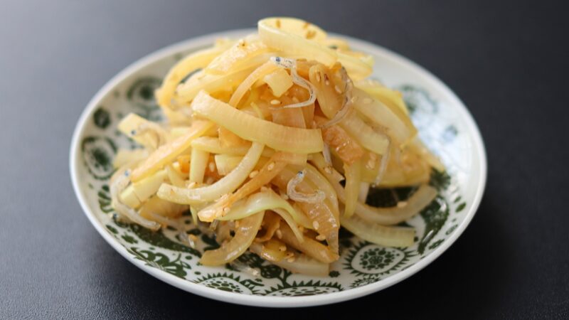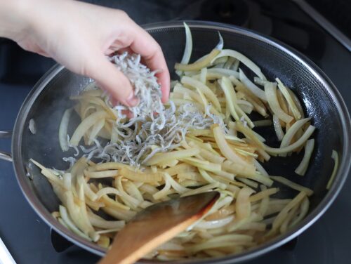 ちりめんじゃこは塩からくならないよう、大根に醤油をなじませた後に入れてください。