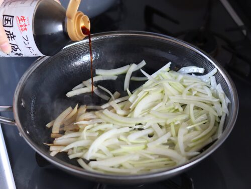 油がなじんでしんなりしたら、醤油を加えてよく混ぜる。
