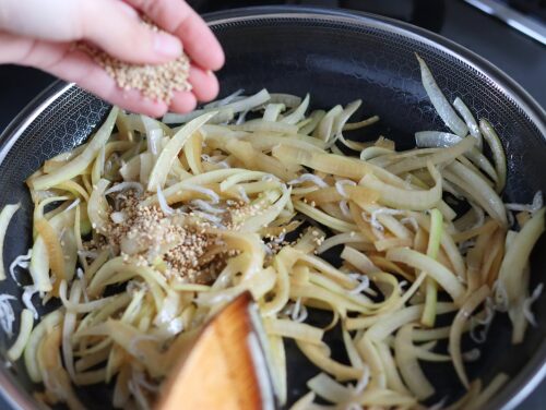 ❸ちりめんじゃこ、白いりごまを順に加える。